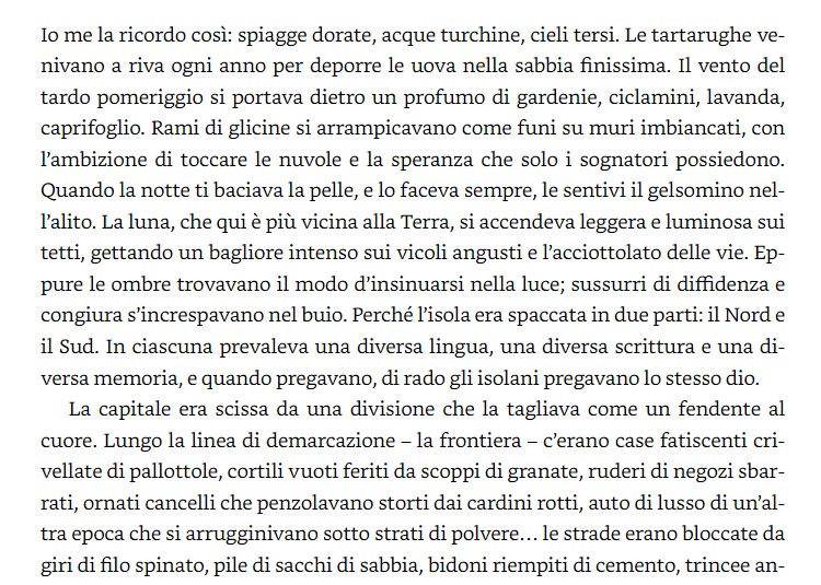 Nata e cresciuta a Londra, Ada Kazantzakis, sedici anni, non sa niente del passato dei suoi genitori. Non sa che suo padre Kostas, greco e cristiano, e sua madre Defne, turca e musulmana, negli anni Settanta erano due adolescenti in quell’isola favolosa di acque turchine e profumo di gardenie chiamata Cipro. Non sa che i due si vedevano di nascosto in una taverna di Nicosia, dalle cui travi annerite pendevano ghirlande d’aglio e peperoncini. Non sa che al centro di quella taverna, testimone dei loro incontri amorosi, svettava un albero di fico. E non sa che l’albero, con le fronde che uscivano da un buco sul tetto, era lì anche quando l’eterno conflitto dell’isola, spaccata in due lungo la «linea verde», si era fatto più sanguinoso e i due ragazzini non erano più venuti. Ora quello stesso albero, nato da una talea trafugata anni prima a Londra, cresce nel giardino dietro la casa di Ada: unico, misterioso legame con una terra dilaniata e sconosciuta, con quelle radici inesplorate che, cercando di districare un tempo lunghissimo fatto di segreti, violente separazioni e ombrosità, lei ha bisogno di trovare e toccare, per poter crescere. Pulsano, in questo libro spalancato sulla distruzione e gli esili provocati dalla guerra, colori luminosi e profumi d’erbe e olive nere; il battere delle ali di uccelli di ogni piumaggio; il canto ininterrotto delle fronde di un albero, il respiro sano di un amore e quello fiero della vita.