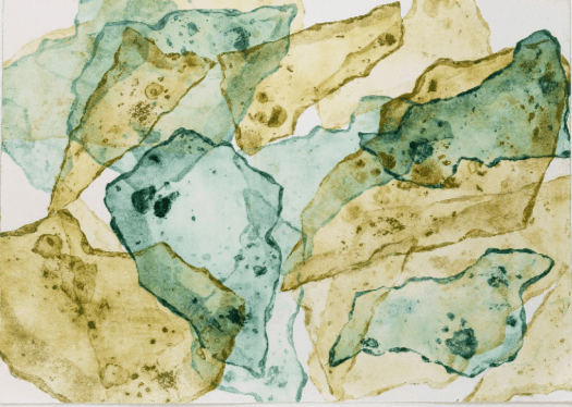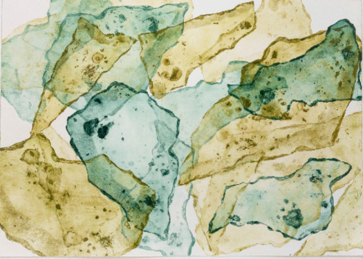 Elisa Carutti propone una selezione di opere grafiche realizzate con ripetuti passaggi al torchio e utilizzando, come matrici, frammenti di lastre metalliche. Il risultato è un equilibrato incontro di forme irregolari e delicate colorazioni.