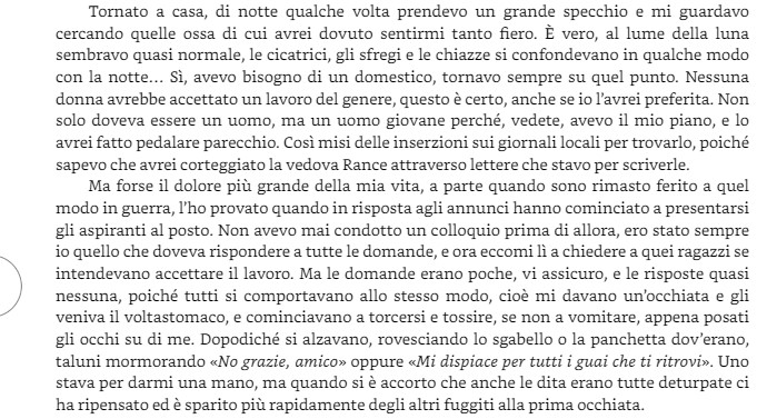 Sandro prosegue: “Letto di un fiato. Una scrittura che non saprei come definire altrimenti se non ipnotica. La storia racconta le vicende di Garnet Montrose dopo il suo ritorno a casa come reduce della seconda guerra mondiale. In guerra è saltato su una mina insieme a tutto il suo reparto. Lui è l’unico sopravvissuto ed è completamento sfigurato, tanto da non aver neanche lui il coraggio di guardarsi. Gli altri di norma vomitano alla sua vista.