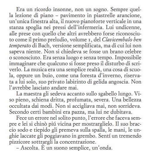 Figlio del capitano Robert Baines, autoritario veterano della Seconda guerra mondiale ora di stanza in Nord Africa, e di sua moglie Rosalind, Roland fatica a capire perché a soli undici anni gli tocchi lasciare le pietre calde e la pazza libertà di Libia, e il fianco tiepido di sua madre, per affrontare un’istruzione rigorosa e solitaria nella fredda Inghilterra. Là faticherà a capire che cosa voglia da lui Miss Miriam Cornell, la temibile insegnante di pianoforte del collegio, che punisce le sue manchevolezze con pizzicotti dolorosi e imbarazzanti e premia i suoi successi con languidi baci sulla bocca, e con gli uni e gli altri in egual misura lo terrorizza e lo attrae. Sarà poi la sua moglie anglotedesca Alissa a confonderlo e straziarlo quando, a pochi mesi dalla nascita del loro bambino Lawrence, abbandonerà marito e figlio al loro destino senza una spiegazione. Roland passerà il resto della vita a interrogarsi su di sé e sulla «natura del danno» che le tre donne – madre, insegnante, moglie – gli hanno procurato. Chi è davvero Roland Baines? Il giovane prodigio del pianoforte il cui straordinario talento è stato frustrato dai soprusi di un’insegnante, o l’indolente pianista di piano-bar che ha rinunciato alle sue ambizioni per pavidità? È il figlio di genitori intransigenti ma amorevoli, o il fratello di bambini come lui defraudati dei loro diritti da una madre degenere? È il marito di una donna spietata che immola gli affetti più cari alla sua arte, o è il soffocante groviglio di bisogni che l’ha costretta alla fuga? L’aspirante scrittore amante della grande letteratura, o il ladro di frasi altrui con cui confezionare biglietti per ricorrenze a pagamento? Il padre premuroso e sempre presente, o l’ostaggio imprigionato in una paternità accollata? È il bambino vittima di abusi o il giovane «incline all’intimità» e alla felicità dei sensi? È tutte queste cose insieme, forse, essere poliedrico come il secolo che la sua vita attraversa? Dalla Crisi dei missili di Cuba alla caduta del Muro di Berlino, dalla glasnost al thatcherismo, dall’invasione dell’Iraq alla pandemia da Covid, Roland pare fluttuare da un’esperienza alla successiva a motore spento, sospinto dalla sola forza dei venti. Ma strada facendo qualche lezione la impara, se alla fine di tutto può approdare a una nuova curiosità d’amore, portato dalla mano piccola di una bambina in cui depositare una lunga eredità.