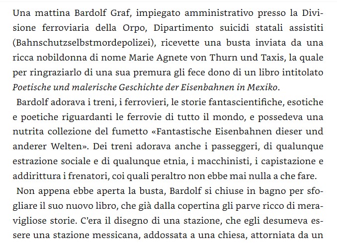 Se cercate dell’avventura, in questo romanzo ne troverete a bizzeffe. Se cercate della letteratura, con questo romanzo ne farete una scorpacciata. I luoghi e i tempi: Asti, Repubblica Sociale Italiana, febbraio 1944; su e giù per le ferrovie del Messico, tra gli anni Venti e gli anni Trenta del secolo scorso. I personaggi (non tutti): Cesco Magetti, milite della Guardia nazionale repubblicana ferroviaria, tormentato dal mal di denti, incaricato di compilare una mappa delle ferrovie del Messico (l’ordine viene dall’alto, molto dall’alto); Tilde Giordano, ragazza bellissima e folle, imbevuta di letteratura, della quale Cesco si innamora all’istante e perdutamente; Steno, devotissimo fidanzato di Tilde, partigiano senz’armi; don Tiberio, prete di città confinato a Roccabianca a causa di certe sue insane passioni; Epa, cartografo samoano (delle Samoa tedesche); Adolf il Führer e la sua consorte Eva, alle prese con l’abuso di anglicismi; Angelo detto Angelino detto Angelito detto Lito Zanon, addetto cimiteriale alla bollitura di cadaveri; Mec il muto, suo sodale fin dai tempi in cui insieme costruivano ferrovie in Sudamerica; le due Marie, entrambe di nome Maria; Bardolf Graf, impiegato amministrativo, ignaro motore immobile di tutta la storia; Ettore e Nicolao, informatissimi e misteriosi clienti fissi del night club segreto l’Aquila agonizzante, prossimi ai partigiani; Gustavo Adolfo Baz, autore del volume Historia poética y pintoresca de los ferrocarriles en México; Edmondo Bo, frenatore poeta, o poeta frenatore, o frenatore e poeta, in ogni caso alcolista e oppiomane; l’orribile Obersturmbannführer Hugo Kraas, amante dell’arte italiana, discutibile golfista e spietato SS; Giustina Decorcipo, compagna d’orfanotrofio di Ettore e Nicolao, violentata e uccisa e gettata sul bordo della strada a sedici anni; Feliciano, bambino morto. Con Ferrovie del Messico Gian Marco Griffi ci ha dato un grande romanzo corale, spassoso e commovente, giocoso e profondo, realistico e fantastico, avvincente senza tregua, scritto con una lingua quasi parlata, sempre cordiale tanto nel registro comico quanto in quello drammatico, e tuttavia letteratissima. Se i numi tutelari di Griffi sono senz’altro Jorge Luis Borges e Carlo Emilio Gadda (e fanno capolino qua e là Roberto Bolaño, Thomas Pynchon e – com’è logico – i Monty Python), il risultato è del tutto originale.