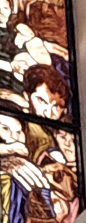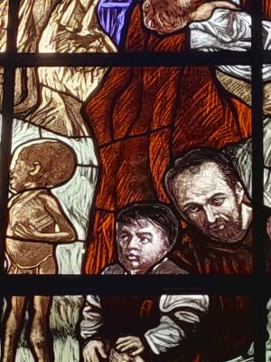 Le immagini delle vetrate maggiori illustrano la vita del Cristo, ma la sorpresa è che ciò che viene ritratto in primo piano. Lì davanti a noi non c’è il Cristo o altri personaggi della storia sacra. Il primo piano, ciò che regge da un punto di vista pittorico tutto il resto della composizione, non è a sfondo religioso, ma sono i volti, i gesti e le espressioni di coloro che quella Chiesa frequentano oltre a numerosi ritratti di gente di Chiavari.