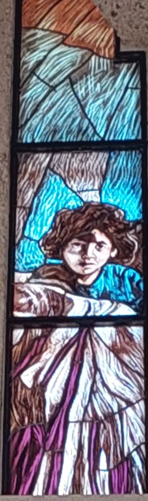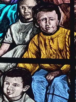 Le immagini delle vetrate maggiori illustrano la vita del Cristo, ma la sorpresa è che ciò che viene ritratto in primo piano. Lì davanti a noi non c’è il Cristo o altri personaggi della storia sacra. Il primo piano, ciò che regge da un punto di vista pittorico tutto il resto della composizione, non è a sfondo religioso, ma sono i volti, i gesti e le espressioni di coloro che quella Chiesa frequentano oltre a numerosi ritratti di gente di Chiavari.