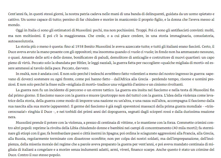 «Cent’anni fa, in questi stessi giorni, la nostra patria cadeva nelle mani di una banda di delinquenti, guidata da un uomo spietato e cattivo. Un uomo capace di tutto; persino di far chiudere e morire in manicomio il proprio figlio, e la donna che l’aveva messo al mondo». Comincia così il racconto di Aldo Cazzullo su Mussolini. Una figura di cui la maggioranza degli italiani si è fatta un’idea sbagliata: uno statista che fino al ’38 le aveva azzeccate quasi tutte; peccato l’alleanza con Hitler, le leggi razziali, la guerra. Cazzullo ricorda che prima del ’38 Mussolini aveva provocato la morte dei principali oppositori: Matteotti, Gobetti, Gramsci, Amendola, don Minzoni, Carlo e Nello Rosselli. Aveva conquistato il potere con la violenza – non solo manganelli e olio di ricino ma bombe e mitragliatrici –, facendo centinaia di vittime. Fin dal 1922 si era preso la rivincita sulle città che gli avevano resistito, con avversari gettati dalle finestre di San Lorenzo a Roma, o legati ai camion e trascinati nelle vie di Torino. Aveva imposto una cappa di piombo: Tribunale speciale, polizia segreta, confino, tassa sul celibato, esclusione delle donne da molti posti di lavoro. Aveva commesso crimini in Libia – 40 mila morti tra i civili –, in Etiopia – dall’iprite al massacro dei monaci cristiani –, in Spagna. Aveva usato gli italiani come cavie per cure sbagliate contro la malaria e per vaccini letali. Era stato crudele con tanti: a cominciare da Ida Dalser e dal loro figlio Benitino. La guerra non fu un impazzimento del Duce, ma lo sbocco logico del fascismo, che sostiene la sopraffazione di uno Stato sull’altro e di una razza sull’altra. Idee che purtroppo non sono morte con Mussolini. Anche se Cazzullo demolisce un altro luogo comune: non è vero che tutti gli italiani sono stati fascisti. E l’antifascismo dovrebbe essere un valore comune a tutti i partiti e a tutti gli italiani.