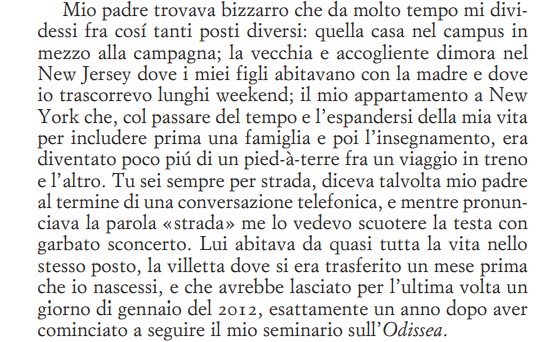 Mendelsohn, che di mestiere insegna letteratura greca, ci racconta due “Odisee”: la prima è quella omerica di cui il libro consente un piacevolissimo e originale ripasso; la seconda è un’odissea personale che l’autore racconta di aver vissuto con il padre, persona ruvida e un pò grossolana con cui aveva rapporti non completamente risolti. Tutto inizia con la sfida forse per scherzo che l’autore lancia al padre a partecipare come osservatore ad un seminario universitario sull’Odissea: il padre accetta e non solo si rileverà il più assiduo dei frequentatori, ma si lancerà in commenti dissacranti sull’eroe omerico creando grande imbarazzo nel docente figlio. Ma saranno proprio questi interventi poco ortodossi che daranno al seminario l’occasione di esplorare nuovi spunti interpretativi e chiavi di lettura veramente originali dell’opera. Bel libro.”
