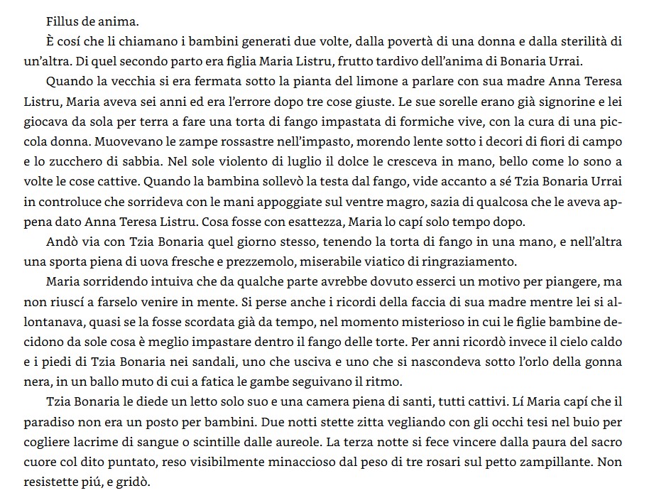 Maria e Tzia Bonaria vivono come madre e figlia, ma la loro intesa ha il valore speciale delle cose che si sono scelte. La vecchia sarta ha visto Maria rubacchiare in un negozio, e siccome nessuno la guardava ha pensato di prenderla con sé, perché «le colpe, come le persone, iniziano a esistere se qualcuno se ne accorge». E adesso avrà molto da insegnare a quella bambina cocciuta e sola: come cucire le asole, come armarsi per le guerre che l’aspettano, come imparare l’umiltà di accogliere sia la vita sia la morte. D’altra parte, «non c’è nessun vivo che arrivi al suo giorno senza aver avuto padri e madri a ogni angolo di strada». Perché Maria sia finita a vivere in casa di Bonaria Urrai, è un mistero che a Soreni si fa fatica a comprendere. La vecchia e la bambina camminano per le strade del paese seguite da uno strascico di commenti malevoli, eppure è così semplice: Tzia Bonaria ha preso Maria con sé, la farà crescere e ne farà la sua erede, chiedendole in cambio la presenza e la cura per quando sarà lei ad averne bisogno. Quarta figlia femmina di madre vedova, Maria è abituata a pensarsi, lei per prima, come «l’ultima». Per questo non finiscono di sorprenderla il rispetto e le attenzioni della vecchia sarta del paese, che le ha offerto una casa e un futuro, ma soprattutto la lascia vivere e non sembra desiderare niente al posto suo. «Tutt’a un tratto era come se fosse stato sempre così, anima e fill’e anima, un modo meno colpevole di essere madre e figlia».