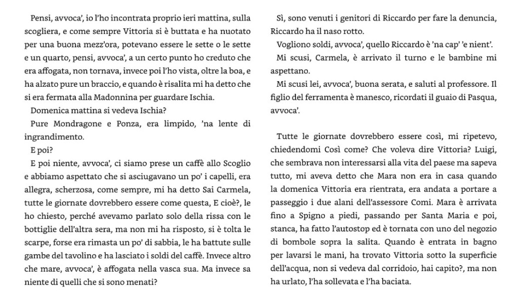 Scauri, nel Lazio, sul Tirreno, seimila residenti nei mesi invernali e centomila nei mesi estivi. Un paese né bello né brutto, ma con una sua grazia scomposta. Qui ha scelto di vivere Vittoria, che è morta nella sua vasca da bagno. È stato uno stupido incidente.
