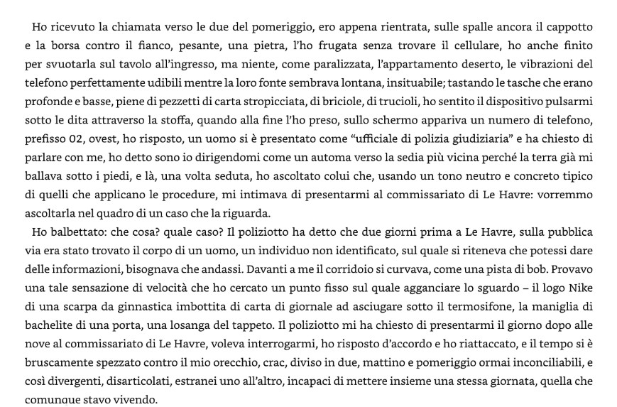 A questo proposito Marco ci scrive: “Sulla spiaggia di Le Havre, dove una donna parigina ha trascorso la propria giovinezza, viene rinvenuto un cadavere che ha in tasca soltanto un biglietto con il suo numero di telefono. Chi è e perché aveva il suo numero? Tutto il romanzo si sviluppa in una giornata in cui l’autrice/protagonista torna fisicamente e con la memoria a Le Havre e a fatti della sua giovinezza . Bello e come tutti i libri della de Kerangal ottimamente scritto.”