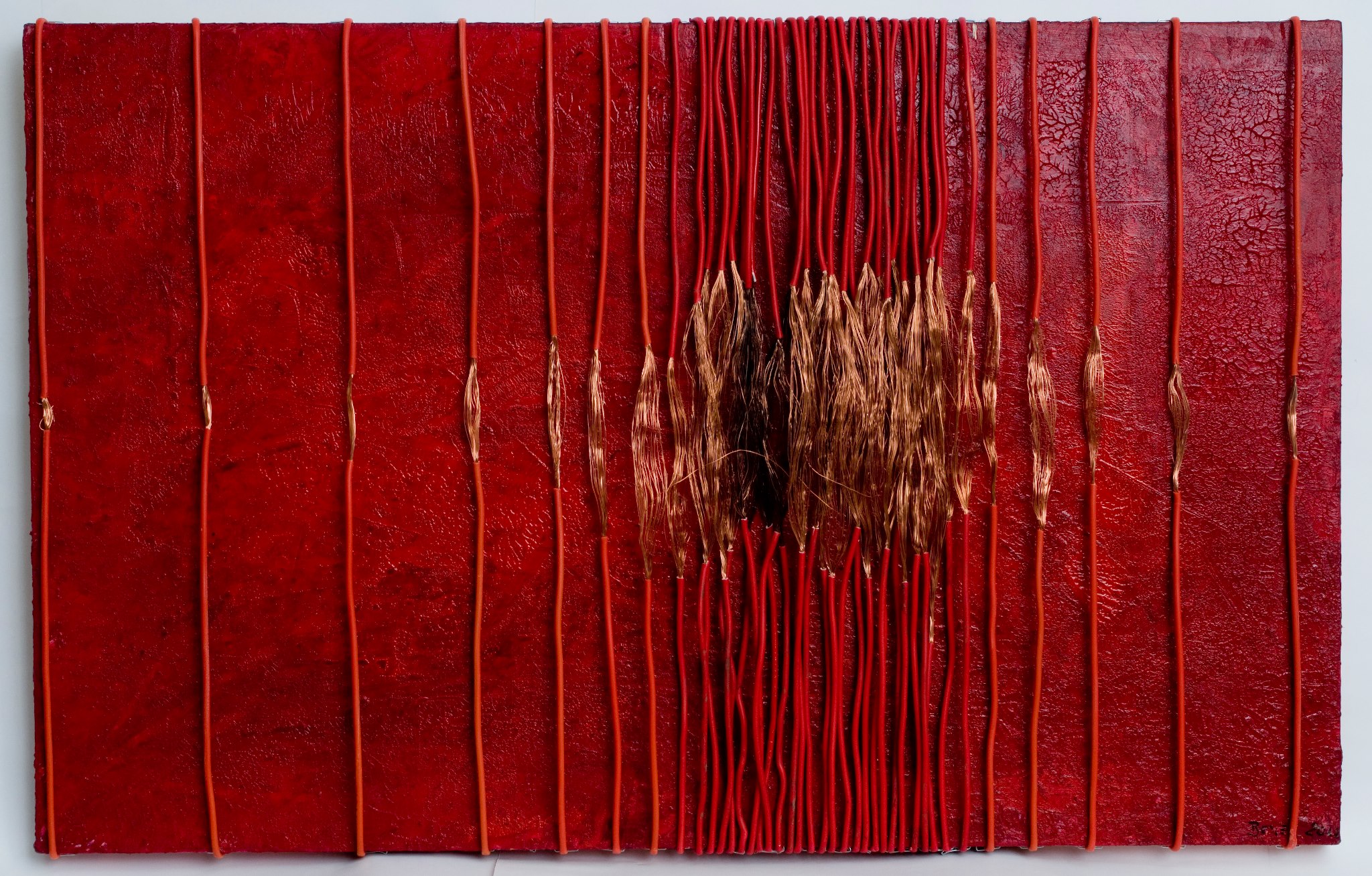 “Horst Beyer, scrive la curatrice Roberta Bani, rende tangibile la ragnatela invisibile di energie che deriva dall’intersecarsi delle vite umane. Stende ed applica pittoricamente i fili elettrici sulla tela e, chi guarda, non può sottrarsi all’incontro con le vibrazioni emotive profonde che pare di riconoscere. Per l’artista, la scelta di utilizzare questo materiale nasce dall’esigenza e dalla presa di consapevolezza del riutilizzo, ma in particolare, dalla sperimentazione, dall’esigenza di avvicinarsi all’astrazione della realtà, per coglierne l’essenza. Il cavo elettrico ha due anime, necessarie per il processo artistico, la guaina di plastica e il filo di rame, una sintesi perfetta della sostanza dell’essere umano, metafora del corpo e dello spirito in un continuo divenire. Come un componimento musicale, nota dopo nota, la materia trova il suo spazio e lascia traccia. Un reticolato di vera e pura energia vibrante. Il tempo interviene sul metallo e sulla plastica, ossida, indurisce e allontana la nitidezza dell’immagine primitiva, proprio come l’azione umana che con lentezza e rassegnazione diventa ricordo e passato. Così, il filo elettrico diventa la reificazione degli incontri, dei flussi di pensiero, dello scorrere degli avvenimenti, delle parole e dei silenzi. I tondeggianti intervalli che ritroviamo negli assemblaggi materici, diventano la dimensione dell’imprevisto, la vertigine, quel cambiamento che accompagna verso la rinascita e spinge verso il domani generando energia.”