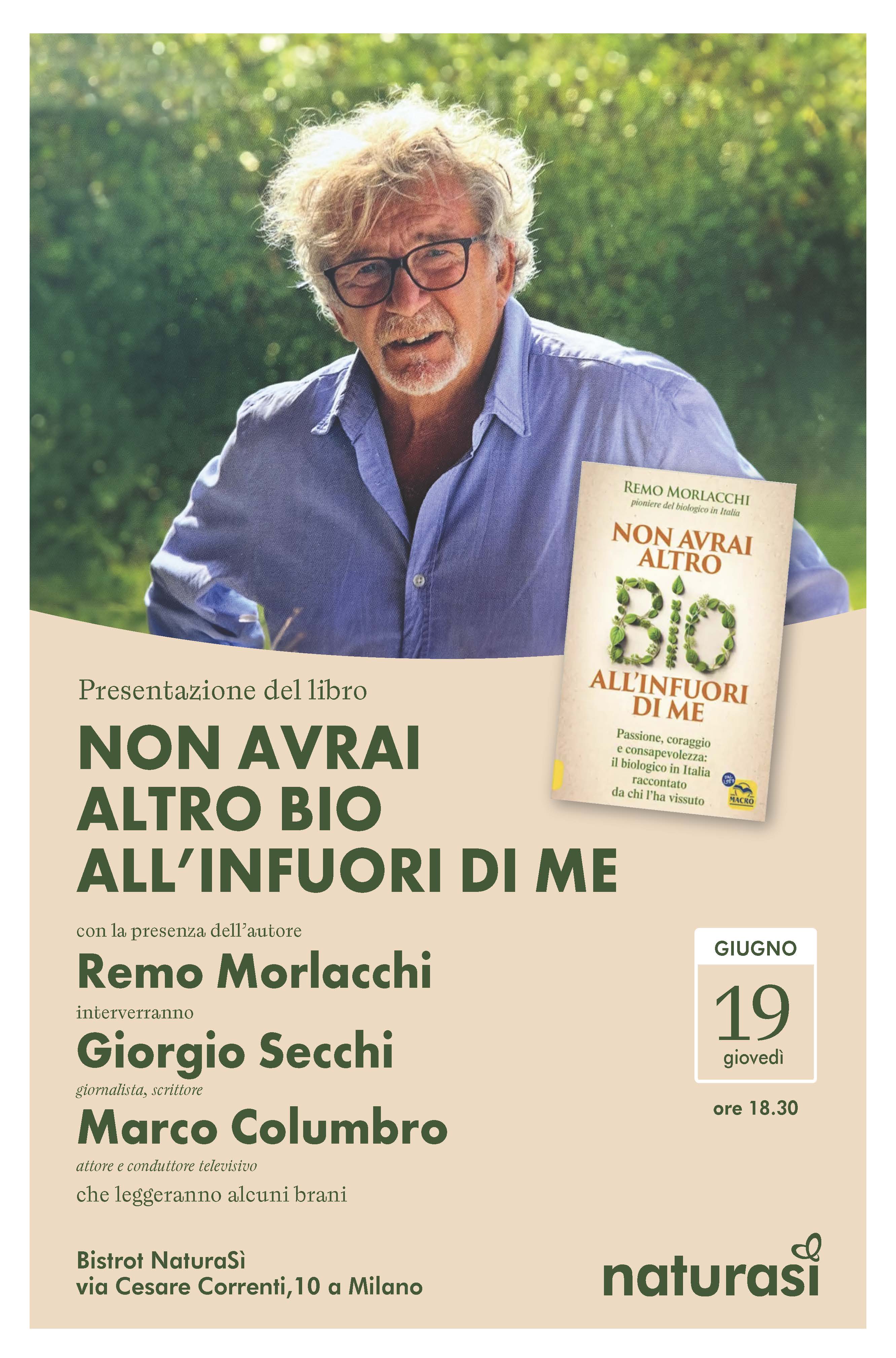 Giovedì 19 giugno alle ore 18.30 presso Bistrot NaturaSì di via Cesare Correnti 10 a Milano Remo Morlacchi presenta il suo libro (Non avrai altro Bio al di fuori di me) discutendone con Giorgio Secchi.