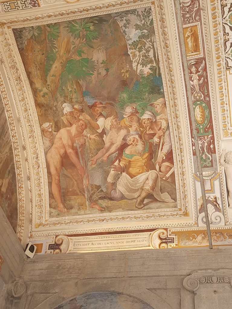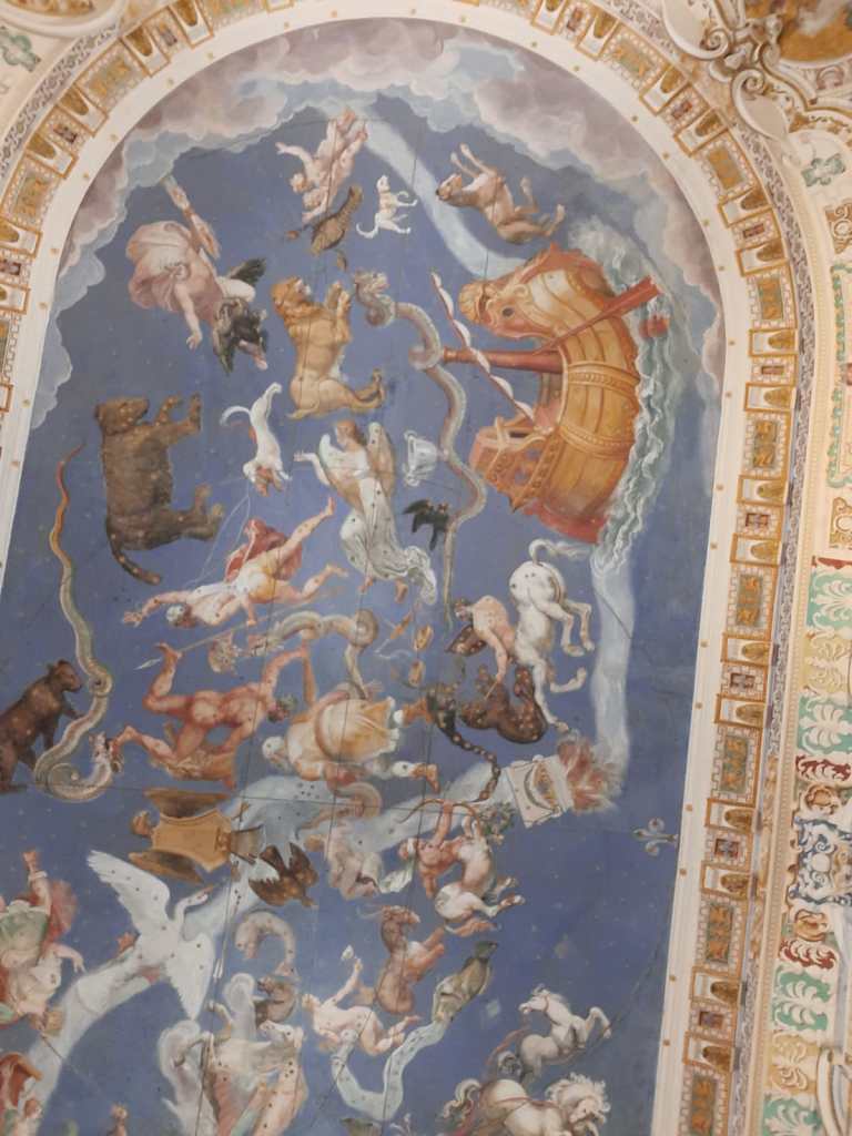 Proseguendo ancora di poco si arriva a Caprarola dove i Farnese fecero i di più. Da fuori il palazzo non gode di eleganza e leggerezza (è un imponente e cicciona ex fortezza pentagonale con due o tre piani sovrastanti il piano nobile forse dedicati alla servitù dell’epoca), ma dentro… dentro è una magnificenza. A partire dalla scala reale che dal piano terra conduce al piano nobile, ogni stanza è affrescata in ogni singola, minuscola o grande che sia, superficie. Uno splendore. In particolare i soffitti lasciano spesso a bocca aperta.