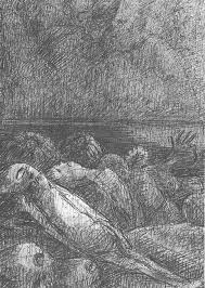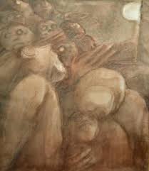 Qui bisogna distinguere tra due lunghe serie di opere. La prima è quella di maggiore riconoscibilità e che forse gli ha dato un maggior e immediato successo postumo: quella dei volti della gente. Cassinelli ha ritratto una serie infinita di persone nei momenti più diversi, tutte persone ritratte con un tratto angosciato e angosciante. Dico “ritratti” con la coscienza che queste opere di ritrattistica classica non hanno niente. Sono figure dolenti, spesso in gruppo, disegnate con un tratto ricorrente e uno stile più fumettistico che pittorico. Di questa serie Cassinelli ha detto: “Cerco la mia strada senza la convergenza del colore, del bello, del piacevole, cercando le mancanze di una società che non è a posto.” In questa serie Cassinelli ha dato prova di una costanza e perseveranza nei soggetti e nella tecnica che rendono tali opere riconoscibilissime, una sorta di marchio di fabbrica, un brand, come si direbbe oggi, che da questo punto di vista lo rende simile alla costanza di Botero a contraris: tanto i ciccioni e le ciccione di Botero ritraevano una borghesia quasi incredula del proprio improvviso benessere, quanto gli uomini e le donne di Cassinelli, ciechi e dolenti, ritraggono una società che ai suoi occhi non funzionava e non funziona.