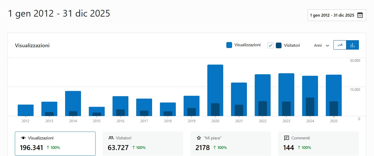 Dicevo che ormai Prima i Lettori si è stabilizzato e la sua comunità è stabile. Come vedete qui sotto è dal 2020 che siamo sempre più o meno gli stessi (bisogna guardare la colonna più scura al centro delle barre). Ho sempre pensato che la costanza sia una virtù, specie in questi ultimi anni così turbolenti (e turbolenti non è certo la parola più adatta per descrivere le mostruosità a cui stiamo assistendo).