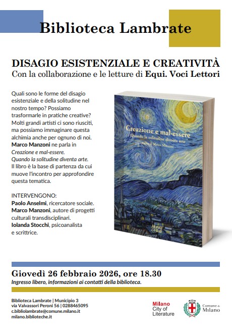Un incontro che dalla raccolta di saggi a cura di Marco Manzoni: “Creazione e mal-essere. Quando la solitudine diventa arte”, propone una riflessione ricca di suggestioni con interventi e letture di Equi.Voci Lettori.