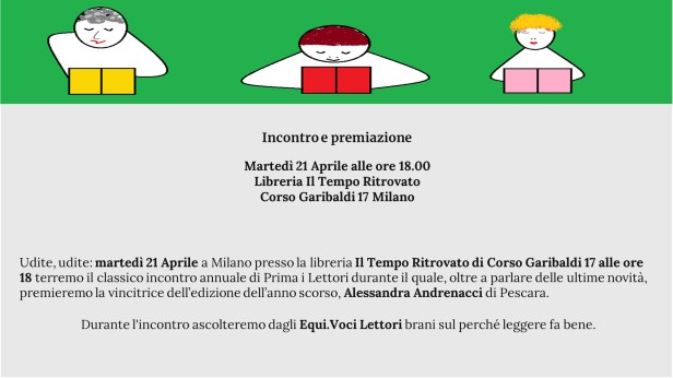 Cari amici vicini e lontani, martedì 21 aprile alle ore 18 presso la libreria Il Tempo Ritrovato di Corso Garibaldi 17 a Milano festeggeremo la vincitrice della scorsa edizione e chiuderemo il periodo di raccolta per l’edizione in corso. Sarà un momento per fare il punto su i lettori e le lettrici in concorso quest’anno e ascoltare due interventi di Equi.Voci Lettori sul piacere della lettura. Vi aspetto.